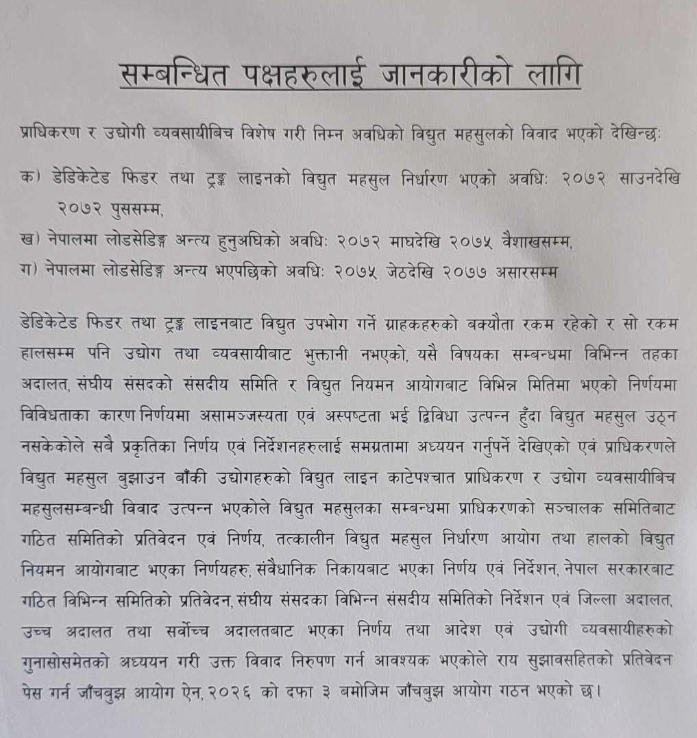 आयोगले नेपाल विद्युत् प्राधिकरणलाइ फागुन २९ गते पत्र लेखेर थप कागजातहरु मगाएको छ । पत्रमा उद्योगीहरुले प्राधिकरणमा दिएका उजुरी, विवाद, समाधानका विषयमा भएका काम र ८१० औं सञ्चालक समितिको निर्णय मागेको छ । उक्त सञ्चालक समितिको बैठकले पूरै बक्यौता उठाउने निर्णय गरेको थियो ।