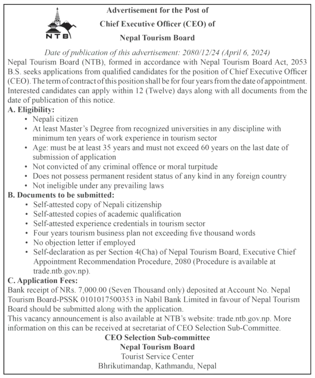 काठमाडौं । नेपाल पर्यटन बोर्डले लामोपछि रिक्त रहेको प्रमुख कार्यकारी अधिकृत (सीईओ) पदका लागि आवेदन माग गरेको छ ।