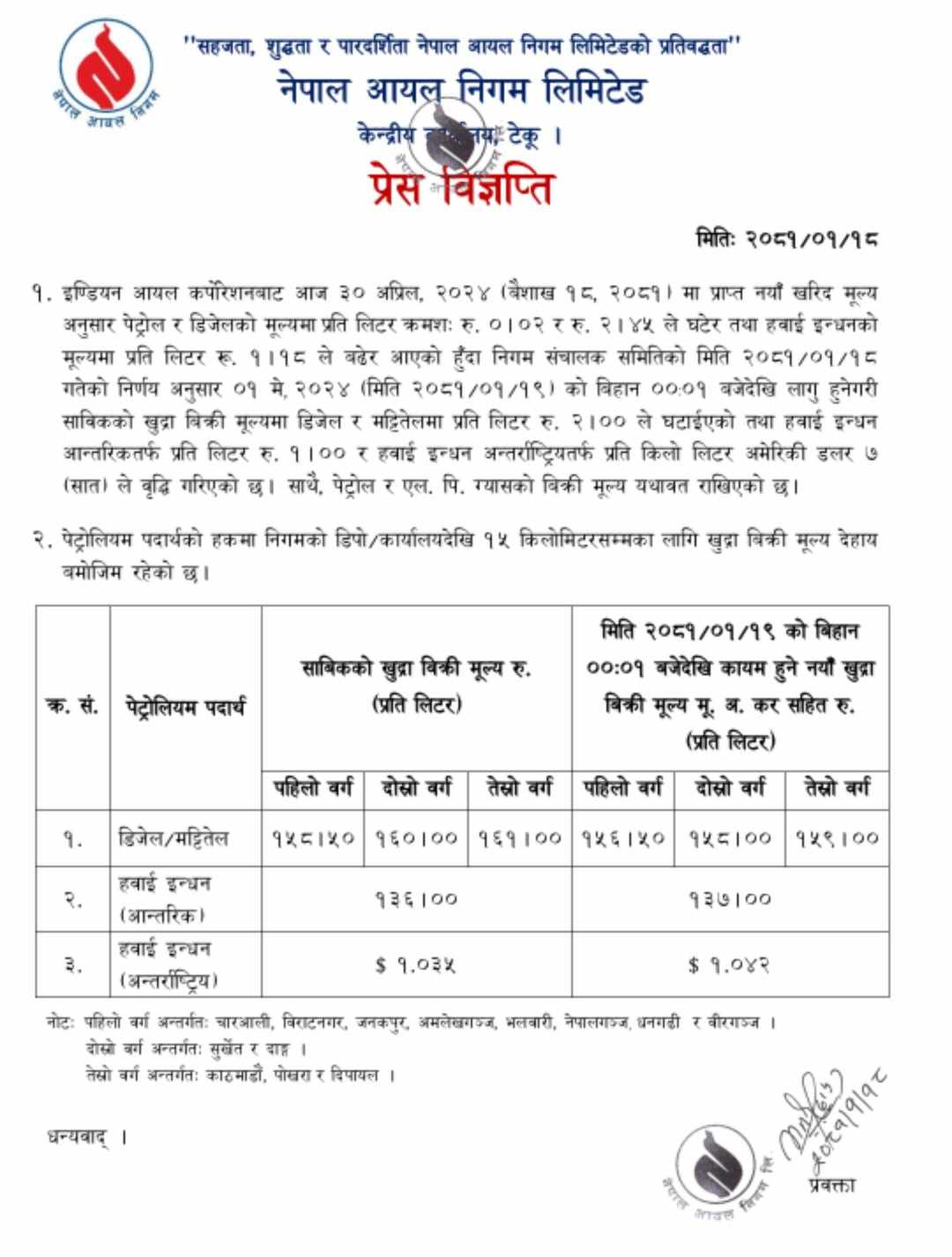 अब डिजल र मट्टीतेलको मूल्य काठमाडौंमा प्रतिलिटर १५९ रूपैयाँ पर्नेछ भने हवाई इन्धनको आन्तरिकतर्फ प्रतिलिटर १३७ रूपैयाँ र अन्तर्राष्ट्रियतर्फ १.०४२ डलर पर्नेछ ।