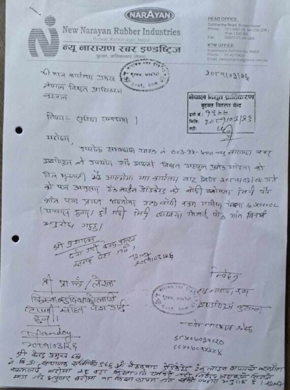 काठमाडौं । न्यू नारायण रबर इण्डष्ट्रिजले ट्रंक डेडिकेटेड लाइनको बक्यौता रकम किस्ताबन्दीमा तिर्ने व्यवस्था गरिदिन माग गर्दै नेपाल विद्युत प्राधकिरणमा निवेदन दिएको छ ।