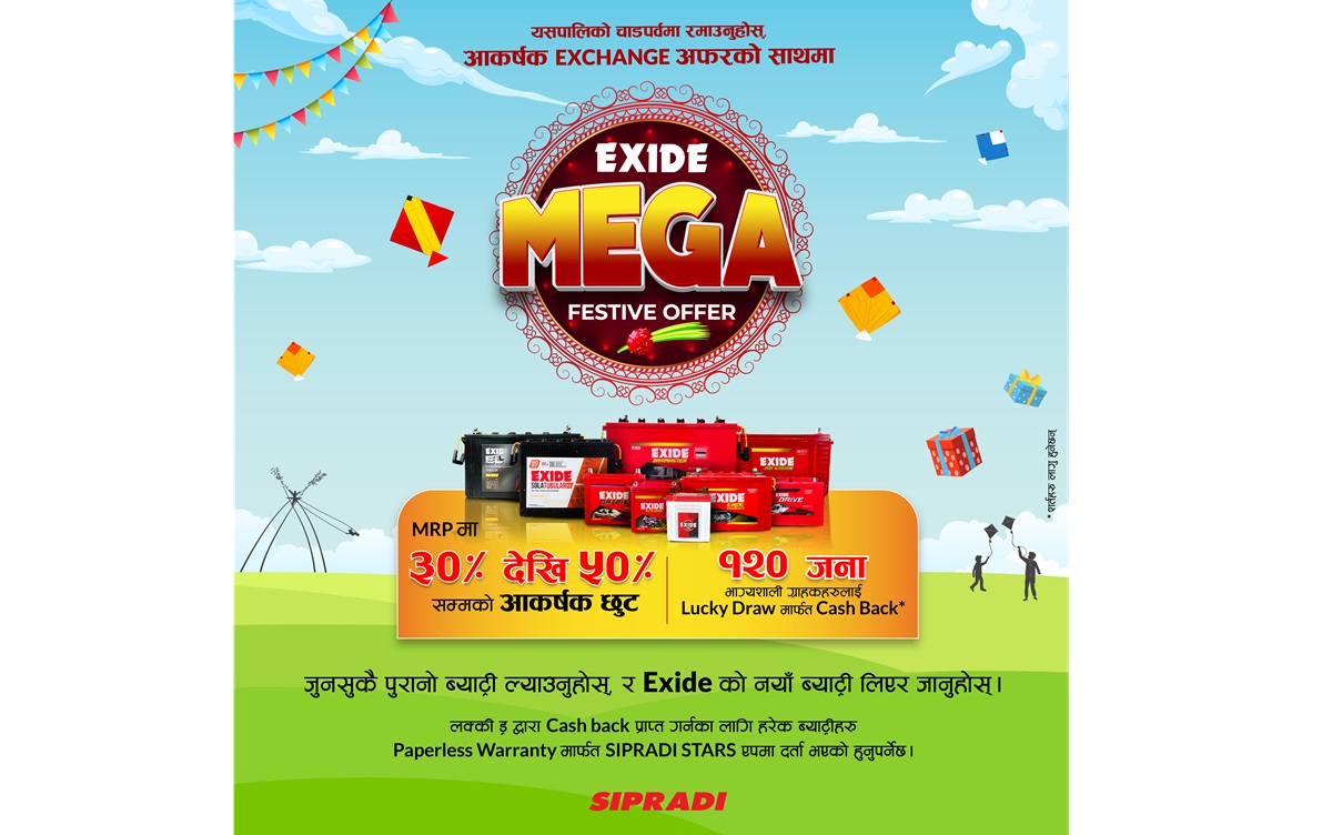 काठमाडौं । एक्साइड इन्डस्ट्रिजको नेपालस्थित आधिकारिक विक्रेता सिप्रदी ट्रेडिङले चाडपर्व विशेष एक्साइड मेघा फेस्टिभ अफर कार्यक्रम सार्वजनिक गरेको छ ।