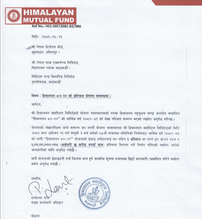काठमाडौं । हिमालयन क्यापिटलको व्यवस्थापनमा सञ्चालित ‘हिमालयन ८०-२०’ म्युचुअल फन्डले प्रतिफल घोषणा गरेको छ ।