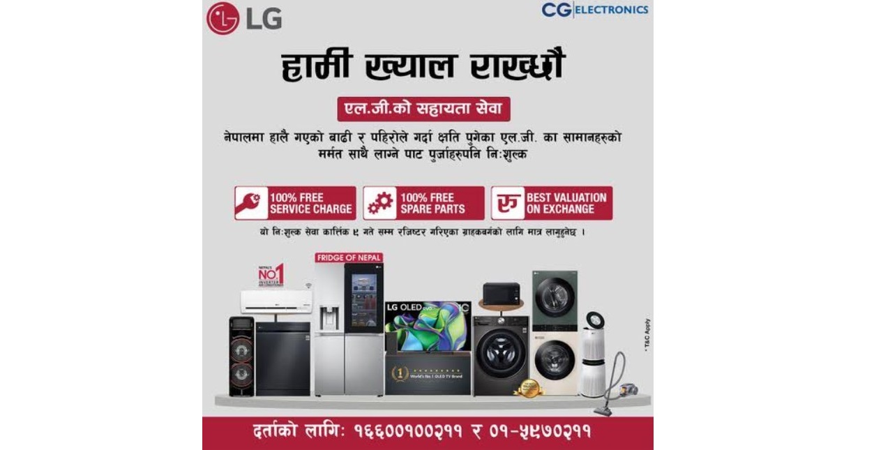 यो सेवा प्रदान गर्न, कम्पनीले ‘एलजीको सहायता सेवा’ नामक मर्मत सहायता कार्यक्रम सुरु गरेको छ । जसअन्तर्गत बाढी र पहिरोबाट प्रभावित भएका वारेन्टीभित्रका उत्पादनहरूको निःशुल्क मर्मत गर्ने कम्पनीले जनाएको छ।