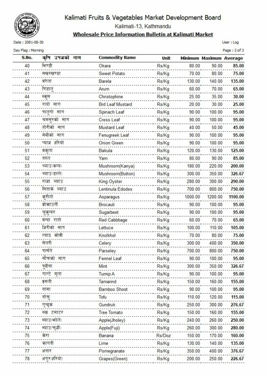 यसैगरी तिते करेला ९५, लौंका ६५, परवर लोकल ६५, परवर तराई ८५, चिचिण्डो ५५, घिरौला ८५, पाकेको फर्सी ५५, हरियो फर्सी (लाम्चो) ४०, हरियो फर्सी (डल्लो) ७५, भिण्डी ८५, बरेला १३५, स्कुस ३०, रायो साग २५, पालुङ्गो साग ९५, चमसुरको साग ९५, तोरीको साग ४५, मेथीको साग ९५, हरियो प्याज ९५, बकुल्ला १२५, तरुल ८५, कन्ये च्याउ २००, डल्ले च्याउ ३२६.६७, राजा च्याउ २९०, सिताके च्याउ ७५०, ब्रोकाउली ९५ र भेडे खुर्सानी ८५ रुपैयाँ प्रतिकिलोमा बिक्री भएको छ ।