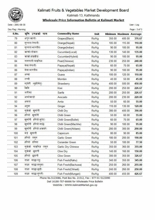 यस्तै लोकल सानो गोलभेडा ५०, टनेलको सानो गोलभेडा ७०, रातो आलु ५७.६७, सेतो आलु ५३, प्याज ९३, गाजर ९५, बन्दा लोकल ५५, बन्दा तराई ४५, बन्दा नरिवल ४५, स्थानीय काउली ८५, तराई काउली ८०, ज्यापु काउली ८५, सेतो मुला २७.६७, लाम्चो भान्टा ६५, डल्लो भान्टा ८५, तने बोडी १२५, मटरकोशा १५५, घिउसिमी १०५ र टाटे सिमी ९५ रुपैयाँ प्रतिकिलोमा बिक्री भएको छ ।