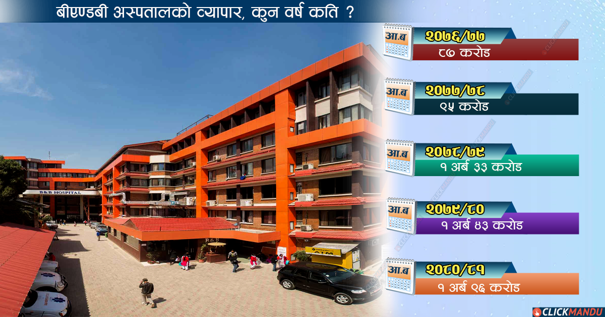 काठमाडौं । डाक्टरहरुले मिलेर खोलेको अस्पताल बीएण्डबी अस्पतालले १ वर्षमै १ अर्ब ९६ अर्बको व्यापार गरेको छ । ललितपुरको ग्वार्कोमा अवस्थित ३ सय शैयाको बीएण्डबीले गत आवको तुलनामा ५३ करोड बढीको व्यापार गरेको हो ।