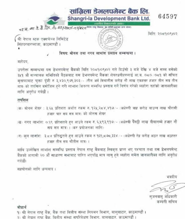 काठमाडौं । सांग्रिला डेभलपमेन्ट बैंकले सेयरधनीलाई लाभांश घोषणा गरेको छ ।