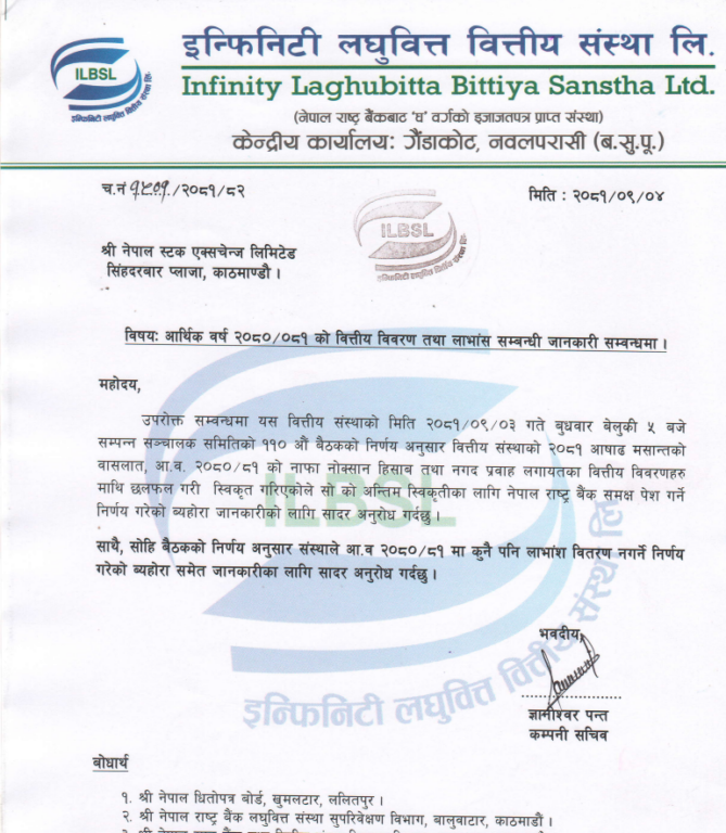 काठमाडौं । इन्फिनिटी लघुवित्त वित्तीय संस्थाले सेयरधनीको हात खाली बनाएको छ । कम्पनीले यो पटक सेयरधनीको हात खाली बनाउने भएको छ । बुधबार बसेको कम्पनी सञ्चालक समितिको बैठकले गत आवको नाफाबाट यो पटक कुनै पनि लाभांश नदिने निर्णय गरेको हो ।