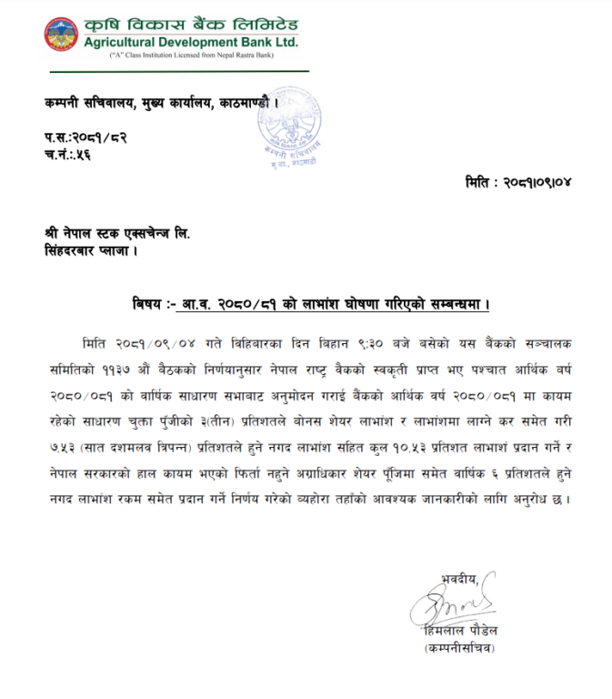 काठमाडौं । कृषि विकास बैंकले सेयरधनीलाई लाभांश दिने प्रस्ताव गरेको छ ।