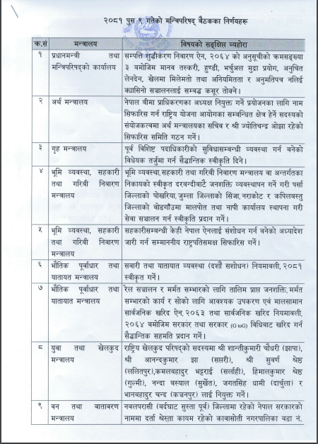 काठमाडौं । नेपाल सरकारले २०८१ पुस ९ गतेको मन्त्रिपरिषद् बैठकबाट १२ वटा निर्णय गरेको छ ।