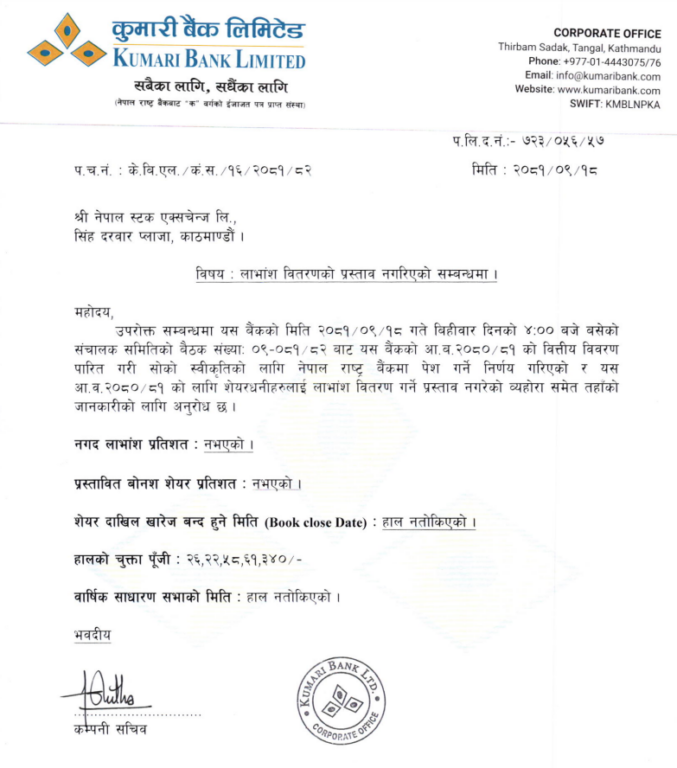काठमाडौं । कुमारी बैंकले सेयरधनीको हात खाली बनाएको छ । बिहीबार बसेको कम्पनी सञ्चालक समितिको बैठकले गत आवको नाफाबाट सेयरधनीलाई लाभांश नदिने निर्णय गरेको हो ।