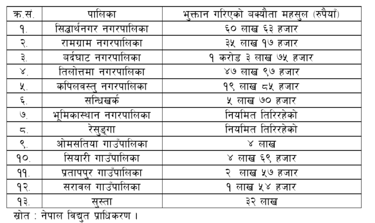 सडक बत्तीको बक्यौता तिर्ने र सडक बत्तीको नियमित रुपमा महसुल तिरिरहेका ओमसतिया, सियारी, प्रतावपुर, सरावल र सुस्ता गाउँपालिकालाई सम्मान गरिएको छ । त्यस्तै, सिद्धार्थनगर, रामग्राम, बर्दघाट, तिलोत्तमा, कपिलवस्तु, सन्धिखर्क, भूमिकास्थान र रेसुङ्गा नगरपालिकालाई सम्मान गरिएको हो । उक्त पालिकाहरुले लामो समयदेखिको सडक बत्तीको बक्यौता रकम भुक्तान गरी नियमित रुपमा महसुल तिरिरहेका छन् ।