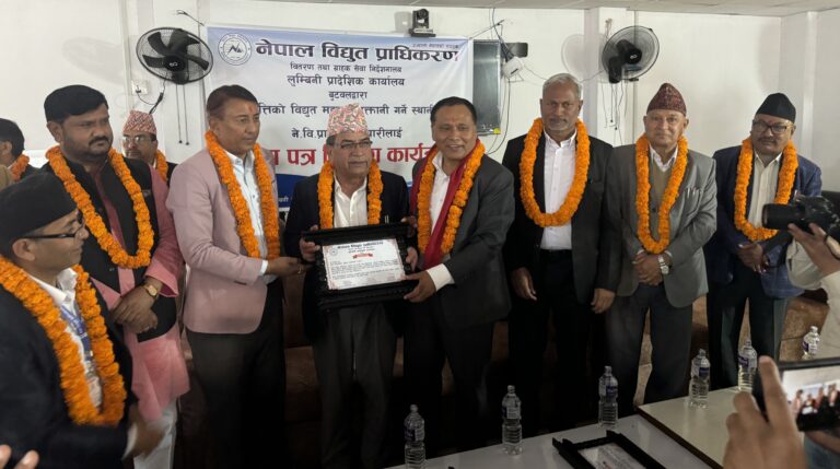 प्राधिकरणकातर्फबाट कार्यकारी निर्देशक कुलमान घिसिङले बुधबार बुटवलमा गरिएको कार्यक्रममा सडक बत्तीको बक्यौता तिर्ने ५ गाउँपालिका र ८ नगरपालिका गरी १३ पालिकाका प्रमुखहरुहरुलाई सम्मानसहित प्रशंसा पत्र वितरण गरे ।