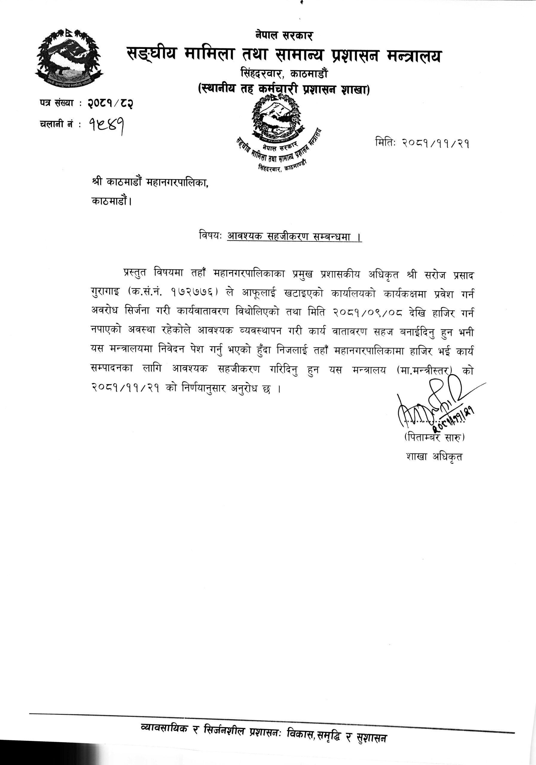 मन्त्रालयको स्थानीय तह कर्मचारी प्रशासन शाखाले काठमाडौं महानगरलाई बुधबार पत्राचार गर्दै भनेको छ, ‘प्रस्तुत विषयमा तहाँ महानगरपालिकाका प्रमुख प्रशासकीय अधिकृत श्री सरोज प्रसाद गुरागाईंले आफूलाई खटाइएको कार्यालयको कार्यकक्षमा प्रवेश गर्न अवरोध सिर्जना गरी कार्यवातावरण विथोलिएको तथा मिति २०८१/०९/०८ देखि हाजिर गर्न नपाएको अवस्था रहेकोले आवश्यक व्यवस्थापन गरी कार्य वातावरण सहज बनाइदिनु हुन भनी यस मन्त्रालयमा निवेदन पेश गर्नुभएको हुँदा निजलाई तहाँ महानगरपालिकामा हाजिर भई कार्य सम्पादनका लागि आवश्यक सहजीकरण गरिदिनु हुन यस मन्त्रालय (मा. मन्त्रीस्तर) को २०८१/११/२१ को निर्णयानुसार अनुरोध छ ।’