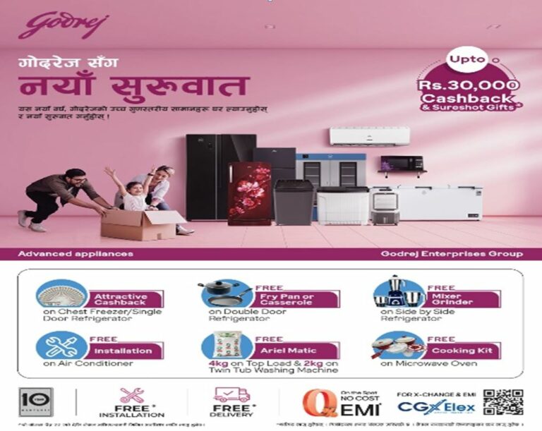 घरमा खुसी र ऊर्जा थप्न, गोदरेजले ३० हजार रुपैयाँसम्मको क्यासब्याक र आकर्षक उपहारसहित नयाँ वर्षको विशेष अफर प्रस्तुत गरेको छ।