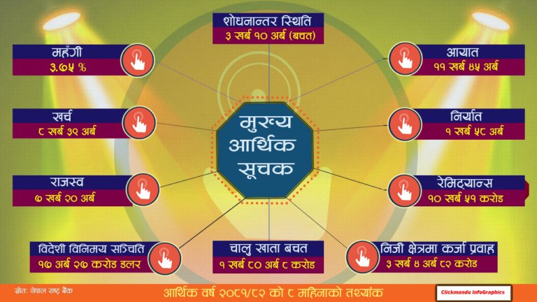 त्यस्तै आयात ११. २ प्रतिशतले र निर्यात ५७.२ प्रतिशतले बढेको छ । नेपाल सरकारको खर्च ८३९ अर्ब ३६ करोड र राजस्व परिचालन ७२० अर्ब ३५ करोड रहेको केन्द्रीय बैंकले जनाएको छ ।