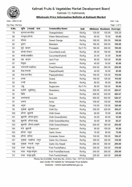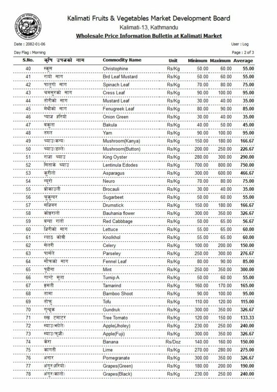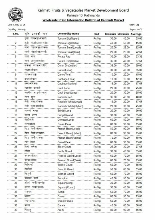 त्यसैगरी सानो गोलभेडा लोकल २२.६७, रातो आलु ३३.३३, प्याज ३९, गाजर लोकल ३५, गाजर तराई १५, बन्दा लोकल १२.३३, बन्दा तराई बन्दा नरिवल १७.६७, स्थानीय काउली २५, स्थानीय काउली ज्यापु २५, सेतो मुला लोकल १७.६७, लाम्चो भान्टा ३०, डल्लो भान्टा ३५, तने बोडी ७०, मटरकोशा ८५, घिउ सिमी लोकल ८५, घिउ सिमी हाइब्रीड ८५, घिउ सिमी राजमा ७५ र टाटे सिमी ८५ रुपैयाँ प्रतिकिलोमा बिक्री भएको छ ।