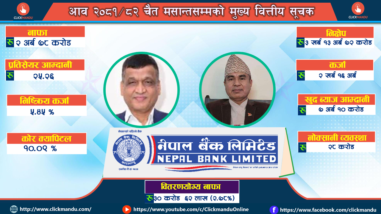 नाफामा छलाङ मार्दा बैंकको वितरणयोग्य नाफा ३० करोड ६२ लाख रुपैयाँ छ अर्थात् चैतको वित्तीय विवरणले बैंकले २.७८ प्रतिशत लाभांश दिनसक्ने देखाएको छ । नेपाल बैंकसँग गत आवको यही अवधिमा लाभांश दिनसक्ने क्षमता थिएन ।