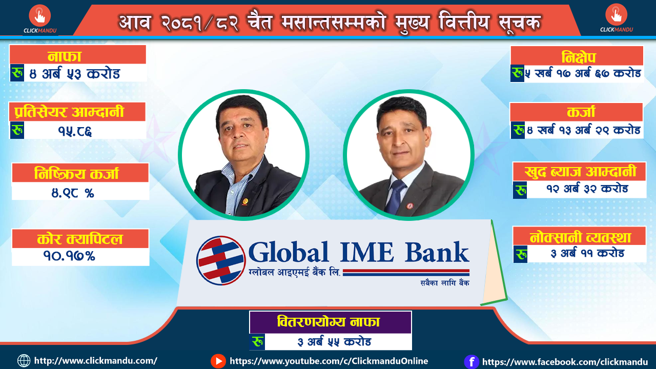 काठमाडौं । ग्लोबल आइएमई बैंकले चालु आर्थिक वर्षको तेस्रो त्रैमाससम्म ४ अर्ब ५३ करोड ४० लाख ९९ हजार रुपैयाँ नाफा आर्जन गरेको छ । जुन गत आर्थिक वर्षको सोही अवधिको तुलनामा ३७.१२ प्रतिशतले धेरै हो । गत आवको सोही अवधिमा बैंकले ३ अर्ब ३० करोड ६५ लाख ५२ हजार रुपैयाँ नाफा कमाएको थियो ।