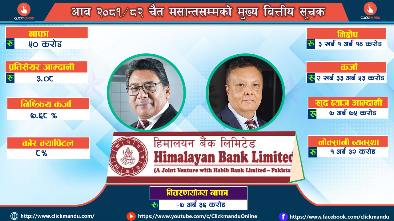 अधिकांश परिसूचकमा कमजोर बन्दा हिमालयन बैंक ७ अर्ब ३६ करोड रुपैयाँ सञ्चित घाटामा पुगेको छ । गत आवको चैतसम्म बैंकको वितरणयोग्य रकम ५ अर्ब २४ करोड रुपैयाँले ऋणात्मक थियो ।