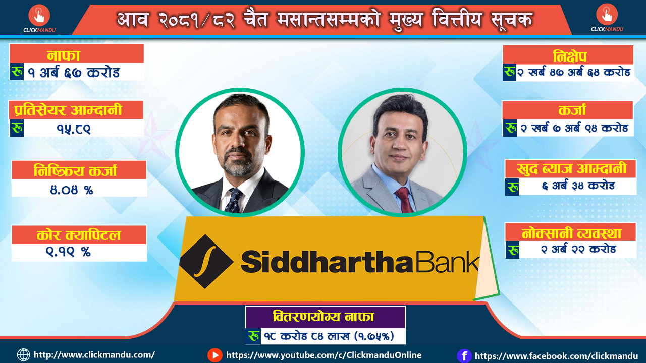 नाफा सामान्य घटेसँगै बैंकको प्रतिसेयर आम्दानी १६ रुपैयाँ १० पैसाबाट घटेर १५ रुपैयाँ ९३ पैसामा झरेको छ। त्यस्तै प्रतिसेयर नेटवर्थ २०७ रुपैयाँ ४८ पैसा र मूल्य आम्दानी अनुपात १७.८४ गुणा छ । चैत मसान्तमा बैंकको प्राथमिक पूँजीकोष अनुपात ९.२१ प्रतिशत सहित पूँजीकोष अनुपात ११.१८ प्रतिशत छ । त्यस्तै निष्क्रिय कर्जा अनुपात २.५२ प्रतिशतबाट बढेर ४.०४ प्रतिशतमा पुगेको छ । सीडी रेसियो ८३.९६ प्रतिशत र चैत मसान्तको आधारदर ६.४६ प्रतिशत छ ।