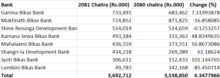 सञ्चालनमा रहेका ८ वटा राष्ट्रिय स्तरका विकास बैंकमा ५ वटाको नाफा बढेको छ भने तीनवटा बैंकको नाफा घटेको छ । नाफा बढाउने बैंकमा गरिमा, कामना सेवा, महालक्ष्मी, सांग्रिला र ज्योति विकास बैंक रहेका छन् । यस्तै नाफा घटाउने बैंकमा मुक्तिनाथ, शाइन रेसुङ्गा र लुम्बिनी विकास बैंक रहेका छन् ।