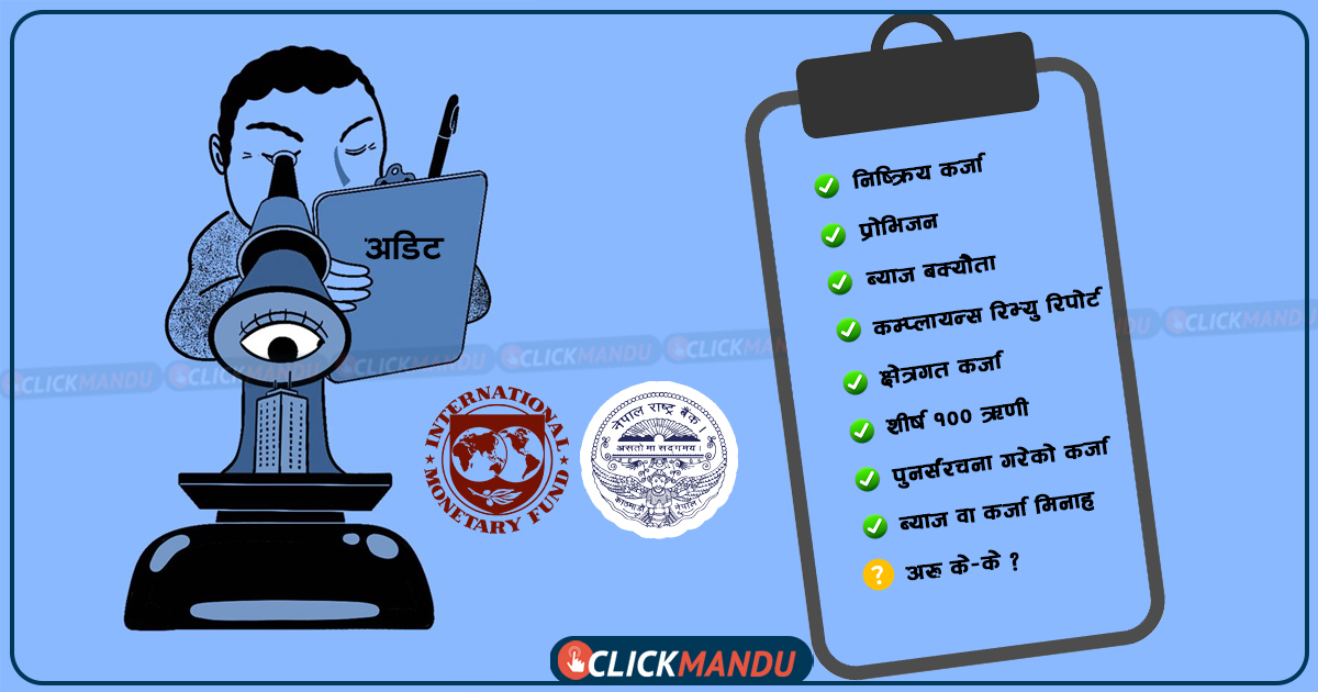 नेपाल सरकारले अन्तर्राष्ट्रिय मुद्रा कोषसँग विस्तारित कर्जा सुविधाको लागि गरेको सम्झौताको शर्तमा १० ठूला वाणिज्य बैंकको सम्पत्तिको गुणस्तर परीक्षण गर्नुपर्ने उल्लेख थियो । उक्त सर्त कार्यान्वयनमा ढिलाई गरेको भन्दै आईएमएफले प्रश्नसमेत उठाउँदै आएको छ ।
