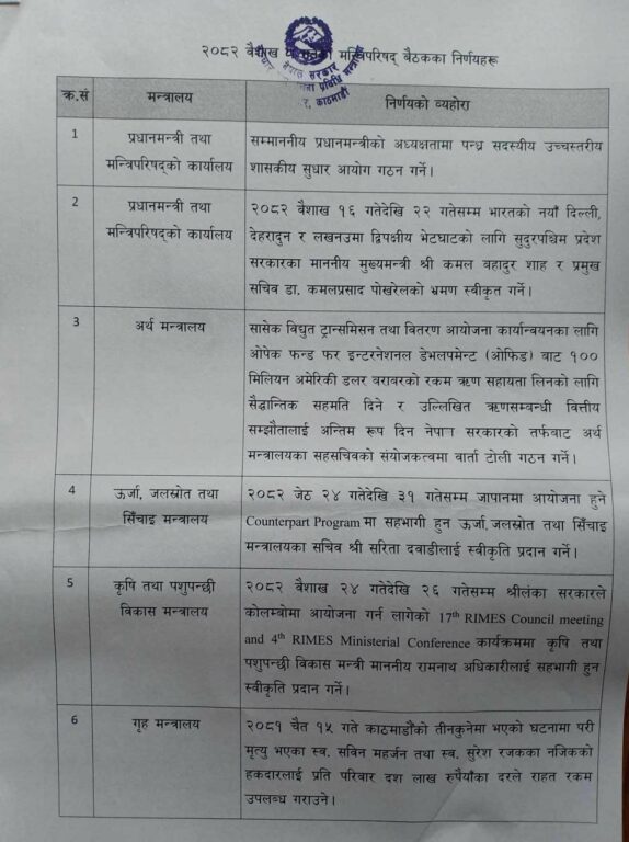 सोमबार बसेको मन्त्रिपरिषद् बैठकले सासेक विद्युत ट्रान्समिसन तथा वितरण आयोजना कार्यान्वयनका लागि औपेक फन्ड फर इन्टरनेशनल डेभलपमेन्टबाट १०० मिलियन अमेरिकी डलर बराबरको रकम ऋण सहायता लिनको लागि सैद्धान्तिक सहमति दिने र उल्लेखित ऋणसम्बन्धी वित्तीय सम्झौतालाई अन्तिम रुप दिन नेपाल सरकारको तर्फबाट अर्थ मन्त्रालयका सहसचिवको संयोजकत्वमा वार्ता टोली गठन गर्ने लगायतका १९ निर्णय गरेको छ ।