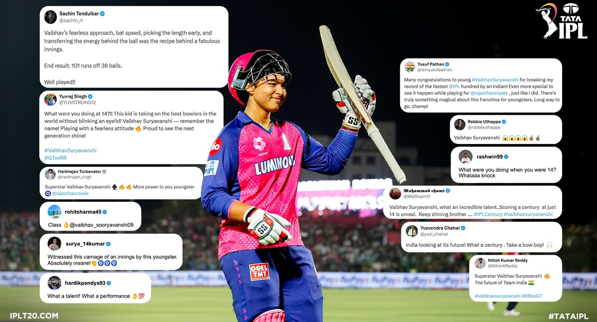 पूर्व क्रिकेटर सचिन तेन्दुलकर, युवराज सिंह, युसुफ पठान, आकाश चोपडा लगायत धेरैले वैभवको तारिफ गरेका छन् । युसुफ पठानले त सामाजिक सञ्जालमार्फत वैभवलाई बधाई दिँदै लेखे, ‘मैले बनाएको भारतीय खेलाडीको सबैभन्दा छिटो आईपीएल शतकको रेकर्ड भंग गर्नु गर्वको कुरा हो । त्यो पनि राजस्थान रोयल्सकै लागि खेल्दै।’
