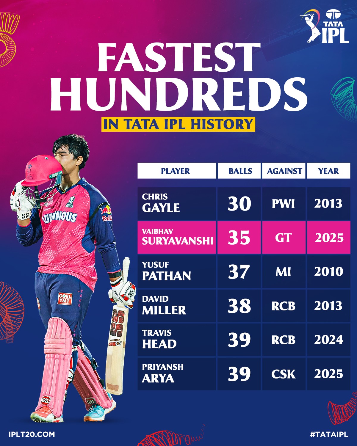 २८ अप्रिल २०२५ मा गुजरात टाइटन्सविरुद्ध वैभवले ३८ बलमा १०१ रन बनाए जसमा ११ छक्का र ७ चौका समावेश थिए । यो शतक आईपीएल इतिहासको दोस्रो छिटो शतक हो र भारतीय खेलाडीहरूमा सबैभन्दा छिटो । उनको यो प्रदर्शनले राजस्थानलाई १५.५ ओभरमै २१० रनको लक्ष्य पूरा गर्न मद्दत गर्यो ।
