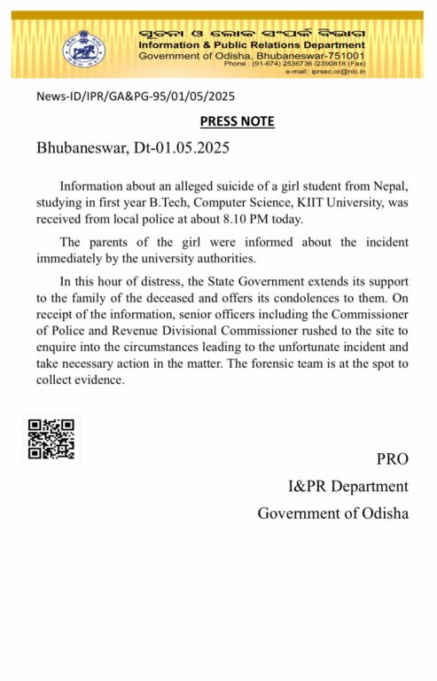कीआईआईटी युनिभर्सिटीमा नेपाली छात्राको आत्महत्या, राज्य सरकारद्वारा शोक व्यक्त