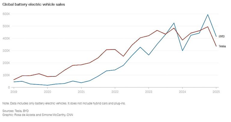 मार्चमा, बीवाईडीले नयाँ ब्याट्री ल्यायो जसले पाँच मिनेट चार्जमा २५० माइलको रेन्ज दिन्छ। यो टेक्सलाको ब्याट्रीभन्दा निकै छिटो थियो। तर केही सातापछि, क्याटल नामक चिनियाँ ब्याट्री कम्पनीले ३२० माइल रेन्ज दिने ब्याट्री ल्याउने घोषणा गर्यो।