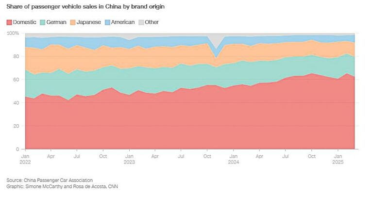 २०२३ देखि नै चिनियाँ उपभोक्ताहरूले घरेलु ब्रान्डलाई दोस्रो दर्जाको रूपमा हेर्न छाडिसकेका छन् । पछिल्लो समयमा चिनियाँ उपभोक्ताले चिनियाँ कम्पनीको गाडी किन्न थालेका छन्। ऊर्जा विश्लेषण संस्था र्हो मोसनका अनुसार, चीनले अहिले विश्व ईभी बजारको ६० % भन्दा बढी हिस्सा नियन्त्रणमा लिएको छ।