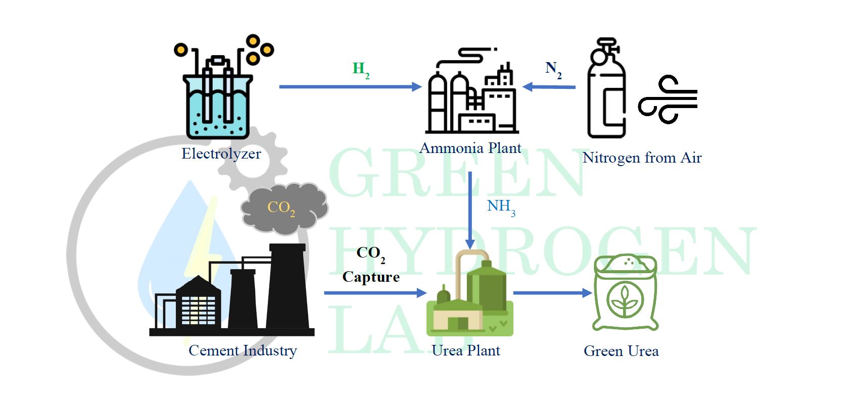 ग्रिन हाइड्रोजन र कार्बन डाइअक्साइडको सहयोगमा विभिन्न चरणवद्ध प्रक्रियामार्फत युरिया मल उत्पादन गर्ने यो परियोजनाको लक्ष्य छ । यसका लागि उपयोग हुने विभिन्न चरण यस्तो छ: