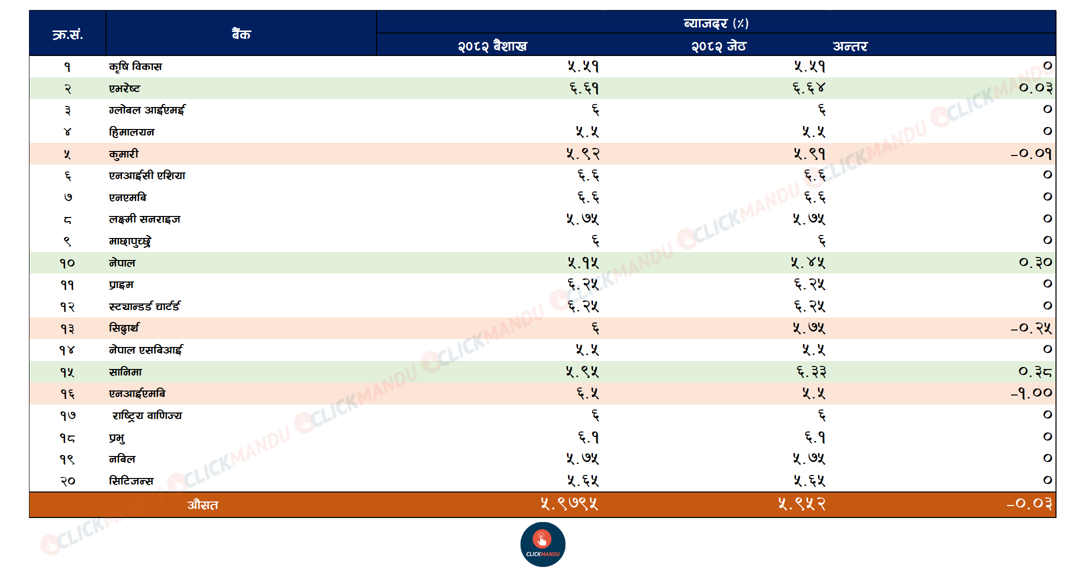यस्तै सिद्धार्थ बैंकले पनि ०.२५ प्रतिशत बिन्दुले ब्याजदर घटाएको छ । वैशाखमा व्यक्तिगत मुद्दती निक्षेपतर्फ ६ प्रतिशत ब्याजदर रहेको बैंकले जेठमा त्यसलाई घटाएर ५.७५ प्रतिशत कायम गरेको हो । अन्य १४ बैंकले भने वैशाखकै ब्याजदरलाई निरन्तरता दिएका छन् । ति बैंकको पनि छोटो अवधिभन्दा पनि लामो अवधिको मुद्दती निक्षेपको प्रकाशित ब्याजदर बढी देखिन्छ ।