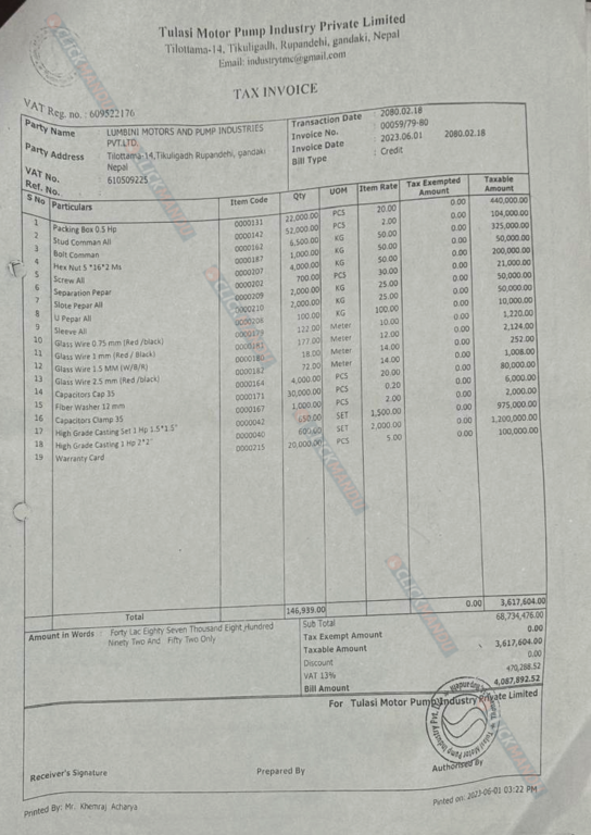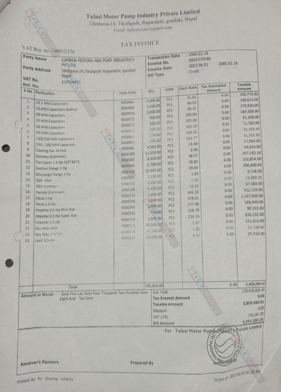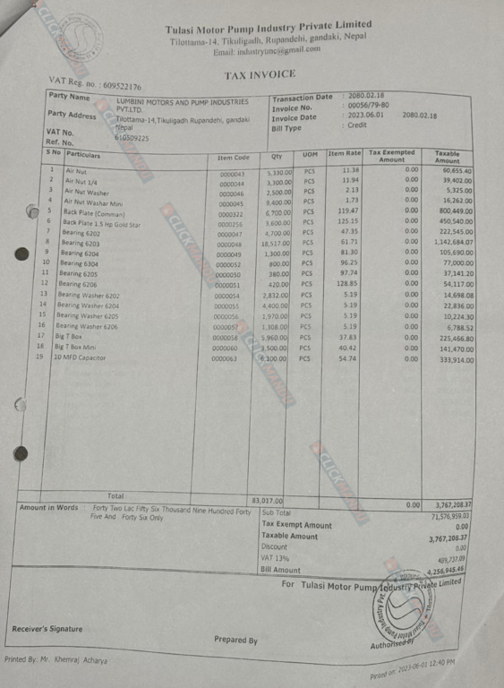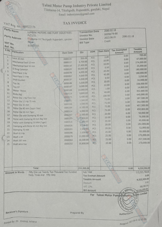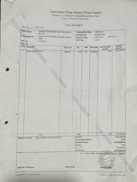क्लिकमान्डुलाई प्राप्त प्रमाणअनुसार, २०८० जेठ १८ गते तुलसी मोटर्सका तत्कालीन प्रवन्धक पदम न्यौपानेले उद्योगको सम्पूर्ण सामग्री व्यवसायी पौडेलको लुम्बिनी मोटर्स कम्पनीको नाममा बिक्री गरे । बिक्रेता कम्पनी तुलसी मोटर्स पम्प इन्ड्रस्ट्रिजबाट लुम्बिनी मोटर्सका नाममा बिल काटिएको छ । न्यौपाने र पौडेलको मिलेमतो देखिएको उक्त सामान किनबेचको बिलमा न त खरिदकर्ताको हस्ताक्षर नै छ, न त बिक्रेताको नै । बिलमा केवल छाप मात्र हानिएको छ । सो बिलमा बिक्री गरिएका सामानहरुको मूल्य उल्लेख गरिएको छ भने क्रेता र बिक्रेता को हुन भनेर हस्ताक्षरमा उल्लेख छैन् ।