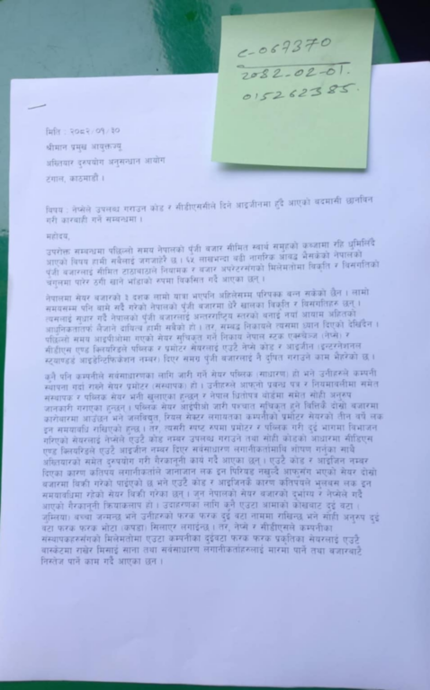 काठमाडौं । सेयर सूचीकृत गर्दा प्रदान गरिने कोड र आइजीन (इन्टरनेशनल स्ट्याण्डर्ड आइडेन्टिफिकेशन नम्बर) लाई कर्मचारीले कमाइ खाने भाडो बनाएको भन्दै अख्तियार दुरुपयोग अनुसन्धान आयोगमा उजुरी परेको छ ।