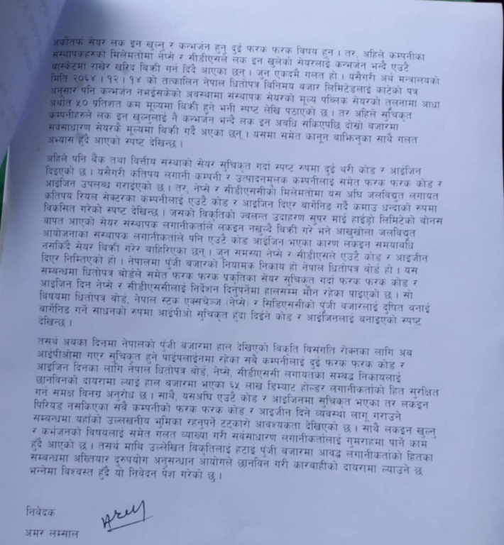 साथै नेप्से र सीडीएसले कम्पनीका संस्थापकहरुसँगको मिलेमतोमा एउटा कम्पनीका दुईवटा फरक फरक प्रकृतिका सेयरलाई एउटै बास्केटमा राखेर मिसाई साना तथा सर्वसाधारण लगानीकर्ताहरुलाई मारमा पार्ने तथा बजारबाटै निस्तेज पार्ने काम गर्दै आएको उक्त निवेदनमा उल्लेख छ ।
