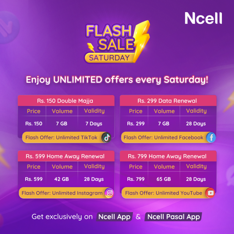 यो फ्ल्याश सेल्स अफरले ग्राहकहरूलाई सुलभ दरमा डिजिटल अनुभव प्रदान गर्ने एनसेलको निरन्तरको प्रतिबद्धतालाई प्रतिबिम्बित गर्दछ । डेटा सेवाको माग र सामाजिक सञ्जालको प्रयोग बढिरहेको अवस्थामा, अनलिमिटेड सोसल मिडिया चलाउन सकिने सुविधा सहित आउने यी प्याकहरूले ग्राहकहरुलाई थप फाइदा प्रदान गर्दछ ।