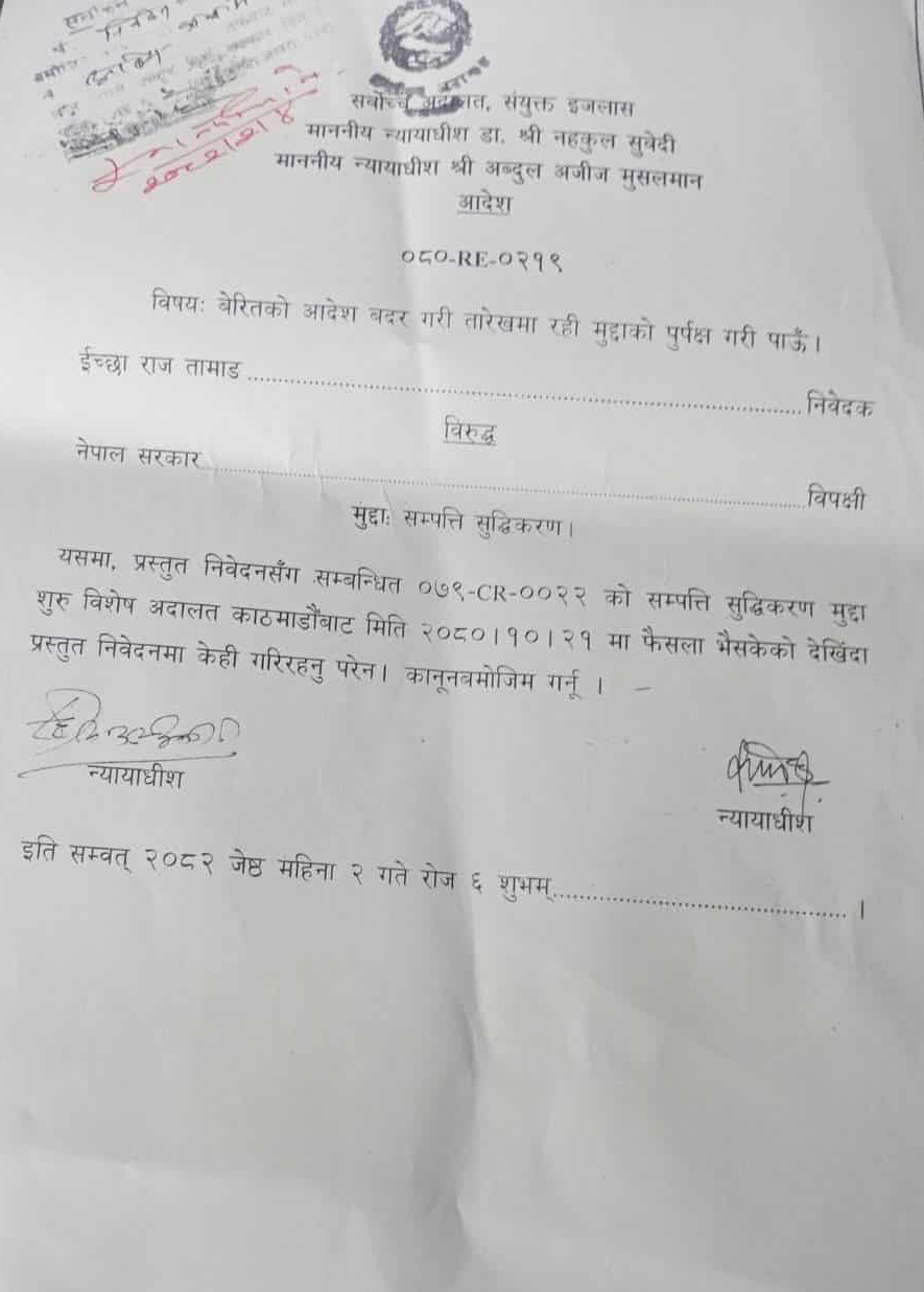 त्यसैगरी, संगठित अपराध, सहकारी ठगी र सम्पत्ति शुद्धीकरण मुद्दामा पुर्पक्षका लागि तामाङलाई थुनामा राख्ने विशेष अदालतको आदेशलाई सर्वोच्चले यथावत् राख्ने निर्णय गरेको छ । सर्वोच्च अदालतले तल्लो अदालतको आदेशविरुद्ध तामाङद्वारा गरिएको निवेदनमा कानूनबमोजिम गर्नू भनी आदेश दिँदै उनलाई थुनामै राख्ने व्यवस्था कायम राखेको हो ।