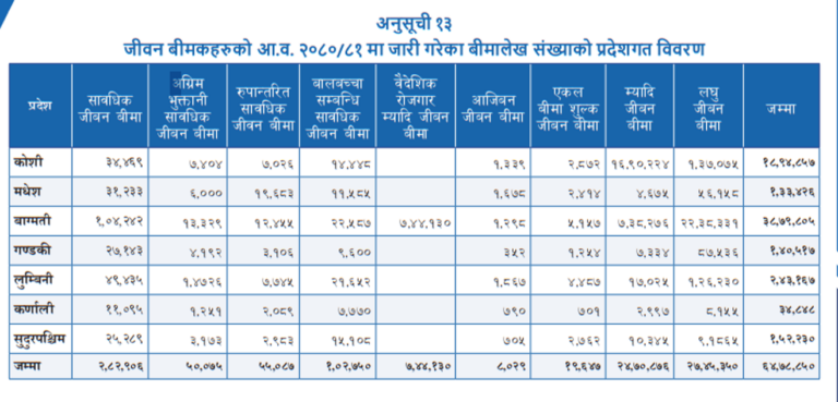 बिमा प्राधिकरणको तथ्यांकअनुसार चालु आर्थिक वर्षको तेस्रो त्रैमास (चैत मसान्त)सम्म ५३ लाख ६४ हजार जीवन बिमालेख (म्यादी, लघु म्यादी र वैदेशिक रोजगार जीवन बिमालेख) जारी भएका छन् ।