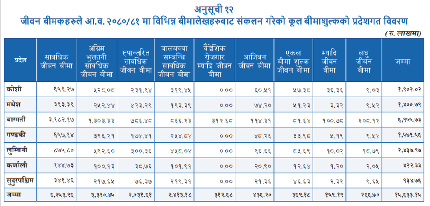 यसमा सावधिक जीवन बिमाबाट ४८ अर्ब ७६ करोड, अग्रिम भुक्तानी सावधिकबाट २६ अर्ब ६६ करोड, रुपान्तरित सावधिकबाट १५ अर्ब ६९ करोड, बालबच्चासम्बन्धी सावधिकबाट १९ अर्ब ४३ करोड, वैदेशिक रोजगार म्यादीबाट २ अर्ब ५८ करोड, आजीवन जीवन बिमाबाट ३ अर्ब २९ करोड, एकल बिमाशुल्कबाट ४ अर्ब ९१ करोड, म्यादी जीवनबाट १ अर्ब ११ करोड, लघु जीवनबाट २ अर्ब ११ करोड र अन्य जीवन बिमाबाट २ अर्ब ४४ करोड संकलन भएको छ ।