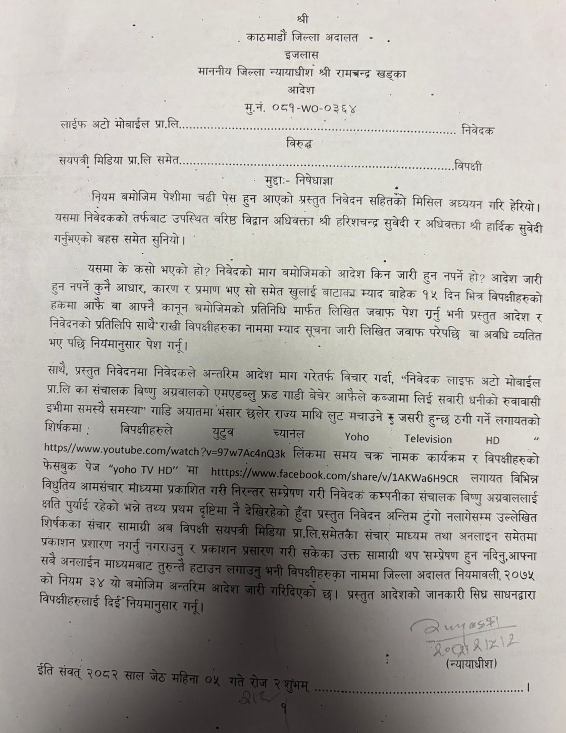 लाइफ अटो मोबाइल प्रालिले दायर गरेको निवेदनमा ‘एमएडब्ल्यू फ्रड गाडी बेचेर आफैंले कब्जामा लिई सवारी धनीको रुवाबासी’, ‘इभीमा समस्यै समस्या’, ‘गाडी आयातमा भन्सार छलेर राज्यमाथि लुट मच्चाउने’, ‘जसरी हुन्छ ठगी गर्ने’ जस्ता शीर्षकमा युट्युब च्यानल ‘योहो टेलिभिजन एचडी’, कार्यक्रम ‘समयचक्र’ तथा उनीहरूको फेसबुक पेजमार्फत सामग्री सार्वजनिक गरिएको थियो ।
