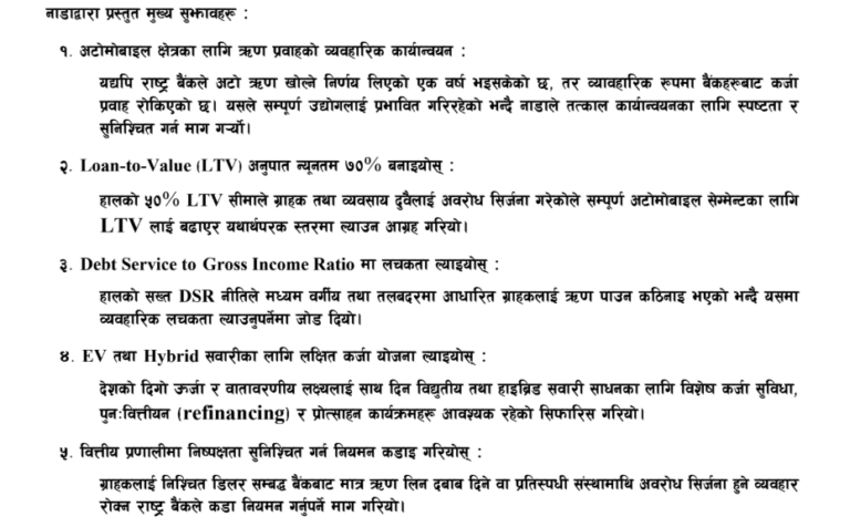 सो भेटमा अध्यक्ष चौधरीले नेपालको अटोमोबाइल उद्योगको समग्र सुधारका लागि तत्काल कार्यान्वयनयोग्य पाँच बुँदे सुझाव दिएका छन् ।