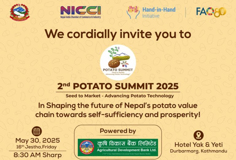 कृषि तथा पशुपन्छी विकास मन्त्रालय, एनआईसीसीआई, ह्यान्ड इन ह्यान्ड, भारत सरकार, नबिल बैंक, एनएमबि बैंक, साल्ट ट्रेडिङ कर्पोरेशनलगायतका सहकार्यमा दोश्रो पोटाटो समिट नेपालमा हुन लागेको हो ।