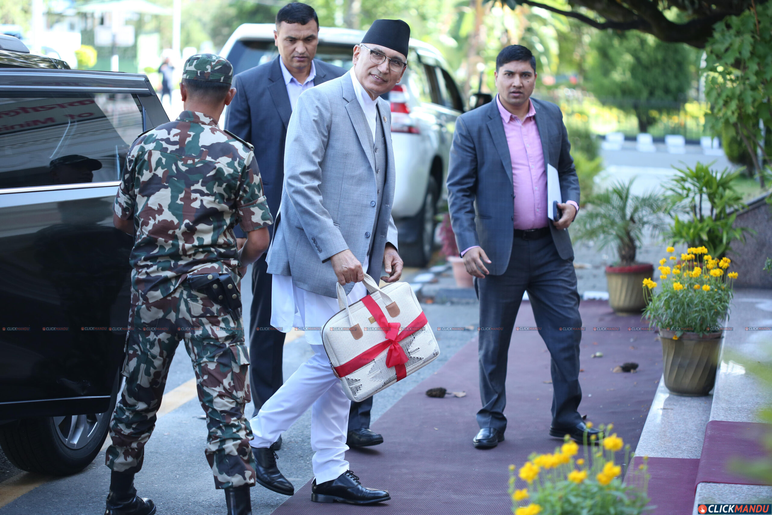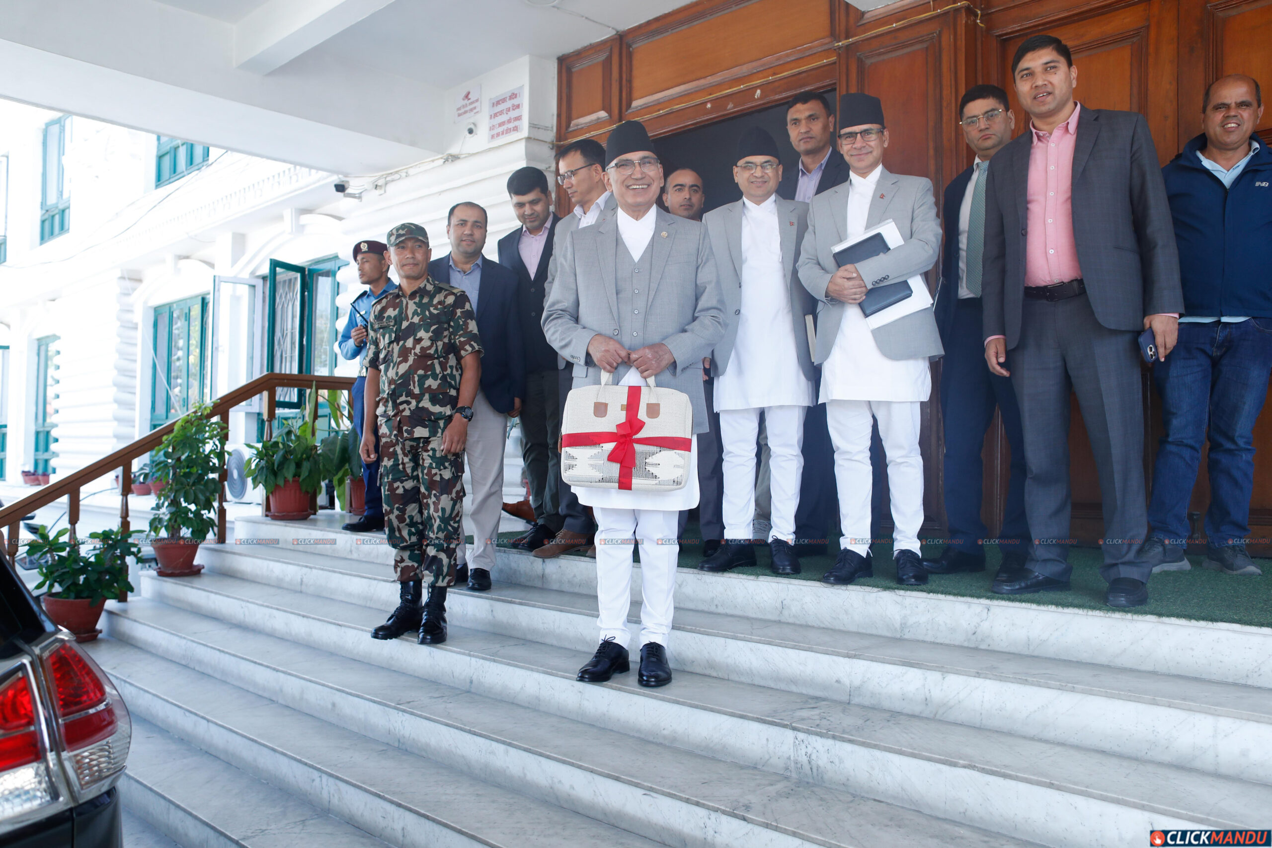 अर्थमन्त्रालयबाट बजेटको झोला लिएर निस्किए अर्थमन्त्री (तस्बिरहरु)