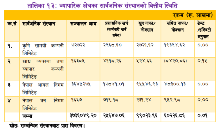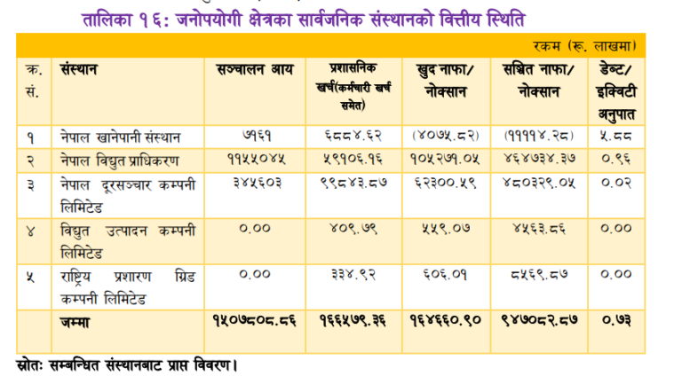 जनउपयोगि क्षेत्रका ५ मध्ये ४ संस्थान नाफामा छन् । नेपाल खानेपानी संस्थान करिब ४१ करोड घाटामा छ । नेपाल विद्युत प्राधिकरणको नाफा करिब १० अर्ब ५३ करोड पुगेको छ । त्यस्तै नेपाल दुरसञ्चार कम्पनी (टेलिकम) को नाफा ६ अर्ब २३ करोड हुँदा विद्युत उत्पादन कम्पनीको नाफा करिब ६ करोड र राष्ट्रिय प्रशारण ग्रिडको नाफा पनि ६ करोड रुपैयाँ नै छ ।