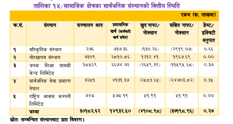 सामाजिक क्षेत्रका ५ मध्ये २ संस्थान मात्रै नाफामा छन् । गोरखापत्र संस्थानको नाफा गत आवमा १२ करोड रुपैयाँ र राष्ट्रिय आवास कम्पनीको नाफा करिब ५२ लाख रुपैयाँ छ । गोरखापत्र संस्थानको सञ्चित नाफा करिब २० करोड पुगेको छ ।