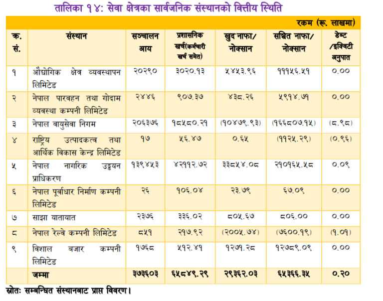 सेवा क्षेत्रका ९ मध्ये ७ वटा संस्थान नाफामा रहेको प्रतिवेदनमा उल्लेख छ । नेपाल वायुसेवा निगमको घाटा गत आर्थिक वर्षका १ अर्ब ४ करोड ७९ लाख हुँदा सञ्चित घाटा १६ अर्ब ६८ करोड पुगेको छ । त्यस्तै नेपाल रेलवे कम्पनीको घाटा गत आर्थिक वर्षमा २० करोड रुपैयाँ छ ।