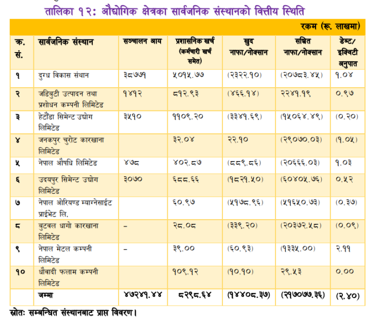 अर्थमन्त्री विष्णुप्रसाद पौडेलले बिहीबार संसदमा पेश गरेको सार्वजनिक संस्थानहरुको आर्थिक वर्ष २०८०/८१ को वार्षिक स्थिति समीक्षा प्रतिवेदनले उद्योग सञ्चालन गरेका १० मध्ये ९ वटा संस्थान घाटामा रहेको देखिएको छ । यस्तै वित्तीय क्षेत्रका १० मध्ये १० संस्थान र व्यापार क्षेत्रका ४ वटै संस्थान नाफामा छन् ।